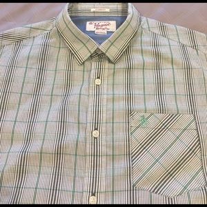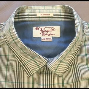 Men's lightly worn penguin button down short sleeve dress shirt. Classic fit with pocket. Gray and green checkered pattern. Smoke and cat free home.