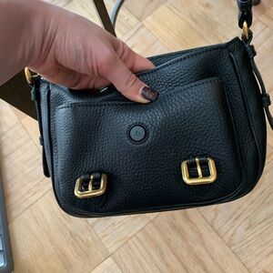 Like new purchased in Switzerland. Supple pebbled leather. 21 inch adjustable strap drop. 5 inches vertical x 8 inches horizontal. Snap/buckle closure