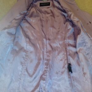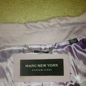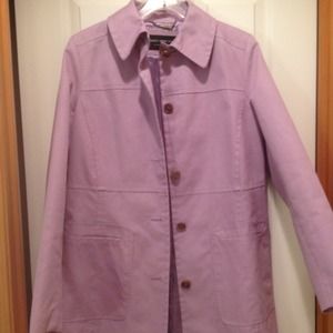 Perfect for Spring!!!!! Pretty lavender swing coat with brown buttons. Polyester lining looks and feels like satin! Coat made by Andrew Marc New York. Coat is in good shape, although 2 buttons are loose on the front. They can easily be tightened up with a needle and thread! Made of a light weight canvas type material. You will get many compliments wearing this beautiful colored coat through spring and summer!