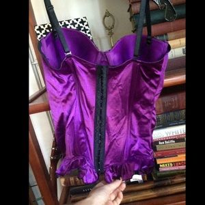 Lovely purple corset with three lines of hooks (see last picture). You can see it's wrinkled from storage, but in in great condition otherwise. Never worn, just sitting in a drawer. Little ruffle on the bottom.