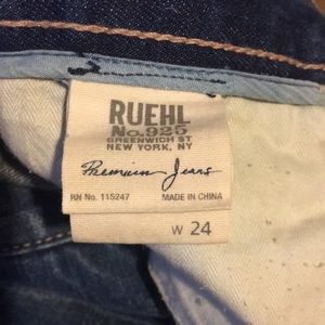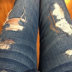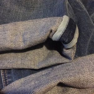 Very well made denim with distressed and patchwork details. Low rise, all seams are finished with denim binding. Super cute to wear with the hem rolled up!