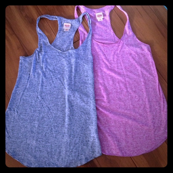 One blue & one pink (fuschia) racerback faded tank. Perfect for layering! Blue is size XS, pink is size S