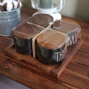 Rae Dunn black Spice cellars with wood lids.