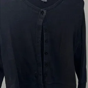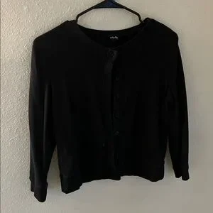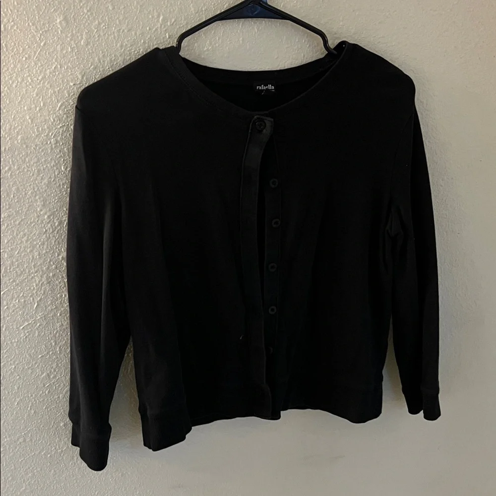 Rafaella petite cardigan with front buttons. Soft knit fabric. Sleek black color for easy pairing. 3/4 sleeves.
