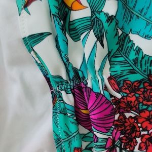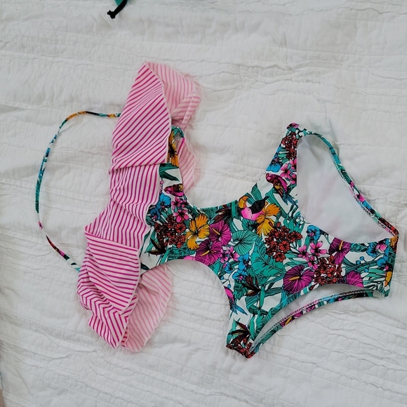 Ruffle top, removable halter strap monokini size small. Raisins brand by Roxy Quicksilver. Worn twice. Cute tropical Hawaii print with pink stripe accent on the ruffle.