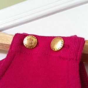Pink and Navy cotton dress. It is sleeveless and hits at the knee on me. It has two gold buttons in the left shoulder. Dress is 100% cotton and is super comfortable! Never worn but I don't have the tags anymore.