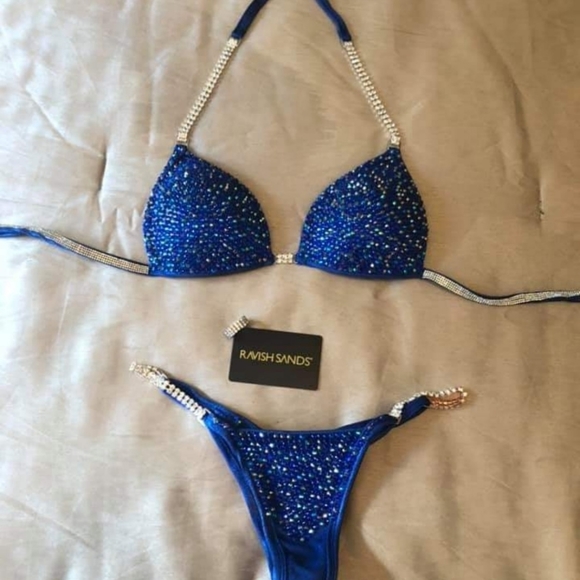 Stunning Sapphire Blue competition bikini. Bikini bite stains on the inside of the bottoms fabric (completely unnoticeable) but immaculate otherwise. Just needs soap/water light scrub to remove. So so gorgeous! $225 firm.