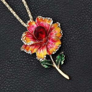 NWOT Peach, pink, yellow, orange flower enamel/rhinestone necklace/pin. This is a pretty piece. Size: 2.16" by x 1.50" inches. Necklace chain: 27.5” inches. Material: Rhinestone / Gold Plated. Really pretty colors. Lead, Nickel and Cadmium Free. Bundle and save! All reasonable offers accepted.