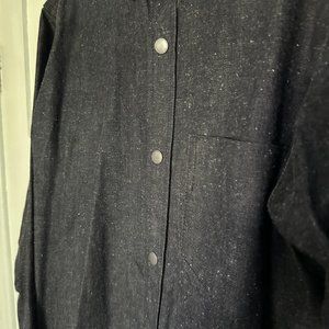 100% Cotton Denim. Snap buttons on front, single chest pocket. Charcoal with flecks of white. Made in California.