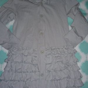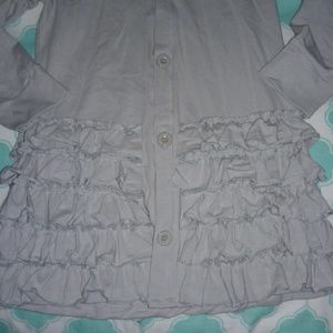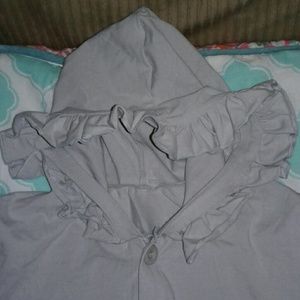 Adorable Ruffle Hooded Jacket in EUC. Buttons all the way up the front, ruffles go all the way around at the bottom. Lighter Gray. Tag says 6XL, fits like a 6/7 (daughter wore while in 6/7- 7)