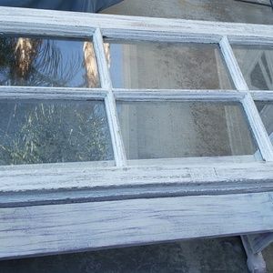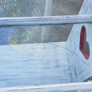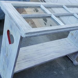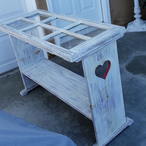Used off white table stand. One heart shape on each side with red lining and one cracked glass square shown in pictures. This is completely paintable from top to bottom and underneath. The current paint is off white but does have a rustic look to it. Pick up only in La mirada, CA.