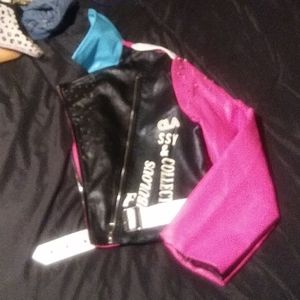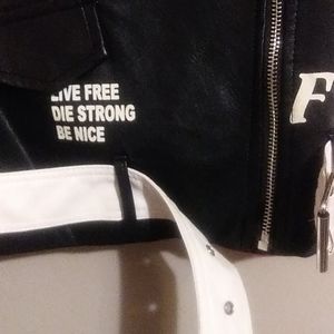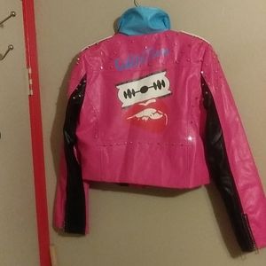 SHORT Collection Jacket with pink, white an blue writing on front and back. Silver studs on the shoulders, white belt. SHORT. In side zippers on the sleeves. Leather LIKE material. Not leather.