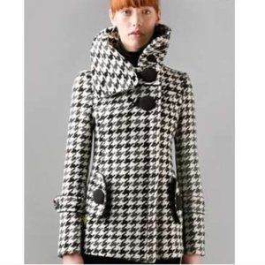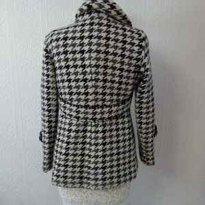 SOIA & KYO Houndstooth in Black / White/ gray. Features oversized black buttons on front pockets and top of collar. Can wear collar folded down or popped up - almost like a built-in scarf. Black zipper. Fully lined. Excellent used condition. 27” in length. Large