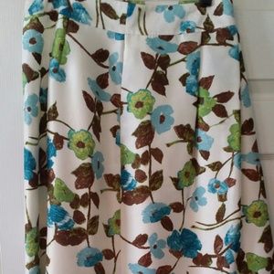 Floral pattern, pretty colors, pleated silk skirt. Excellent condition. Hits right at knee. Fully lined