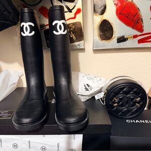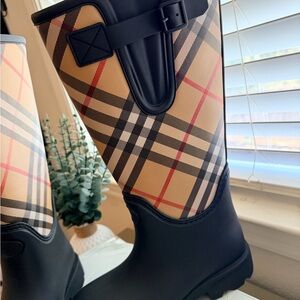 Stay stylish and dry with Burberry's design women's winter rain boots. Featuring a chic black and tan design, these boots are perfect for rainy days. Size 8M.Brand new with box , the box is a little damaged but still usable .