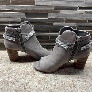 Introducing these SO Authentic American Heritage Ankle Boots in Women's Size 6, the perfect addition to any outfit. The beautiful gray suede material with rhinestone and stud strap accents plus buckles make these boots suitable for any occasion, whether it be a wedding, party, or casual outing. The block heel style provides comfort while the peep toe adds a touch of elegance. These boots are a solid color and have an ankle shaft style, making them trendy and stylish. The adjustable straps and buckles allow for a customized fit. Invest in these American Heritage boots today!