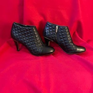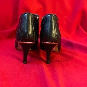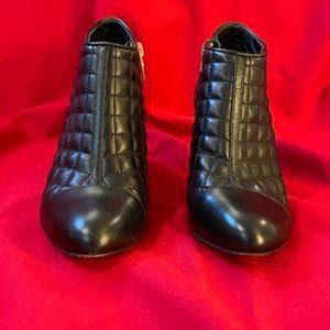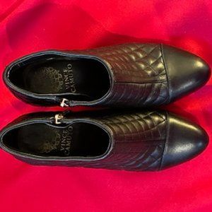 Elevate your shoe game with these Vince Camuto black quilted leather booties. The ultra-high stiletto heel and almond toe shape make them perfect for any occasion, whether it's a party, a casual outing, or a business meeting. The zipper closure provides a comfortable and secure fit, while the synthetic outsole material ensures durability and longevity. See sixth and seventh pictures for flaws.
