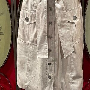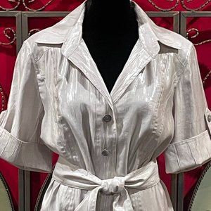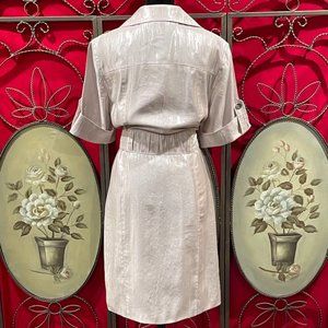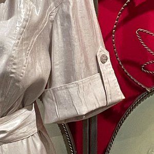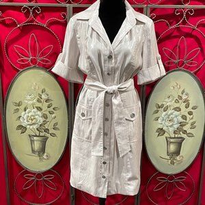 This Chico's jacket dress is an eye-catching addition to any wardrobe. Featuring a solid cream color with metallic accents from the metal buttons, this knee-length dress is perfect for casual or business occasions. The V-neckline and short cuffed sleeves add a touch of sophistication while the front pockets and belted waist provide a practical element to the dress.