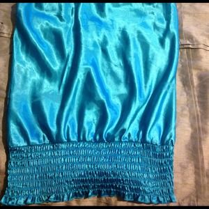 The top is very cute!! Blue satin with an open back, ties around back of neck, and stretchy waist bottom. Size large, bought and never wore