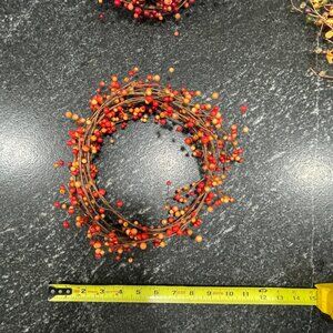 Purchased at Michael's this is a set of 8 Candle Rings for easy Fall/Thanksgiving/Wedding decorations. Two types of wreaths with artificial berries come in vivid shades of orange and red with greenery. Used as a candle ring, the inside diameter is 6 inches across. The natural vine twig backing makes it easy to hang over mantels or in entryways and on doors, wired for easy shaping