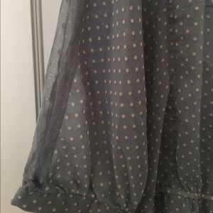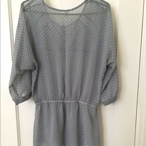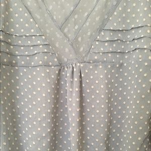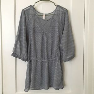 This blouse fits like a loose tunic except for the (stretchy) fitted waist. The pattern is a light blue color that almost looks silver. There are some lace details on the arms and near the neckline.