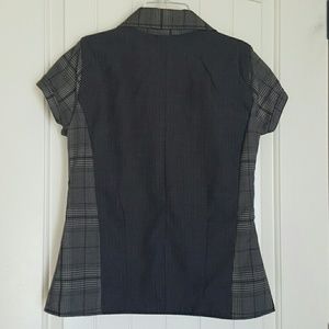 Charcoal and beige short sleeve blazer by vanity 64% polyester 34% rayon 2% spandex
