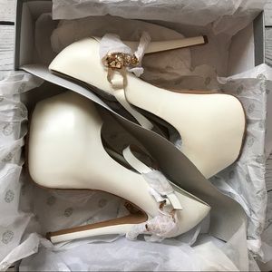 Wow the crowd in this stunning limited edition white mary-jane pump, which features beautiful gold skull and chain ornamentation with adorned jewels. Hidden platform is about 1.5" height and heel is about 5.75" high.