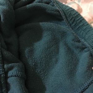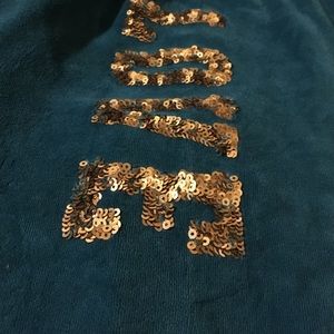 Teal colored sweatpants by VS PINK with gold sequences. Worn 2-3 times. There are signs of pilling on the inside (as seen in photo 4). Otherwise, it is in great condition!