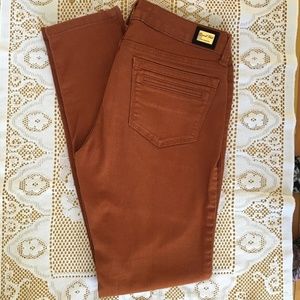 Beautiful burnt sienna/rust color with gold detail and zipper detail on ankle. Skinny stretch fit. Rarely worn. **Material: 74% Cotton, 24% Polyester, 2% Spandex. **Care Instructions: Machine wash cold water, tumble dry low. Made in Vietnam.