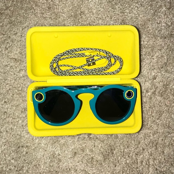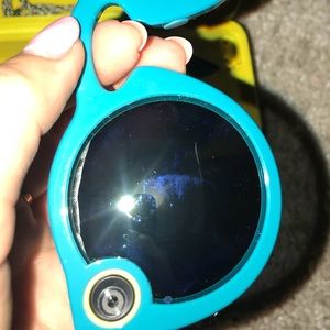 Awesome teal Snapchat spectacles! Worn twice and in fabulous condition! Small scuff on glasses frame but the camera is in perfect/like-new condition. Comes with case and charging cable.