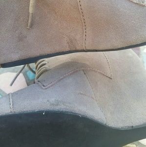 The color is closest to the third picture: a rose tinted grey. Made with leather suede material. Heels about 4" tall. The tongue is a slightly more rose color by design. Bought from consignment shop and worn only 3 times, good condition but is used. Had a minor casualty on soles while trying to be aesthetic (oops ๐