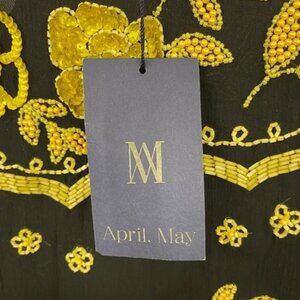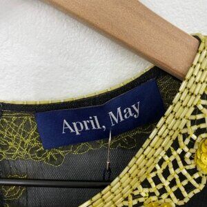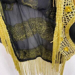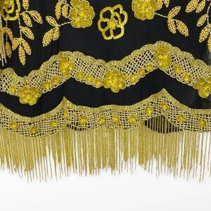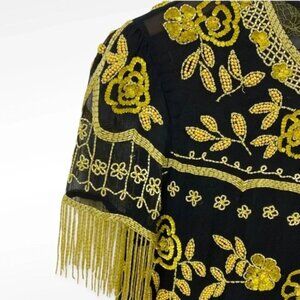 April, May black and yellow floral beaded short sleeve top with beaded fringe. Hook eye closure in back. Such an amazing, unique piece!