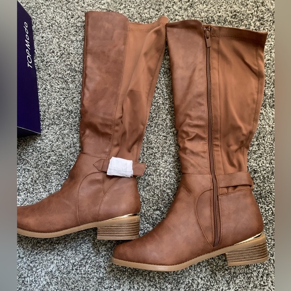 Elevate your style with these TOP Moda Women's Tan High Faux Leather Boots in size 10. The boots feature a pointed toe and over-the-knee shaft style, with a low heel that adds a touch of sophistication. The zip closure makes it easy to slip in and out of these boots, making them perfect for travel, parties, or casual outings.