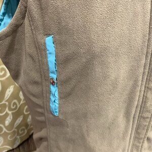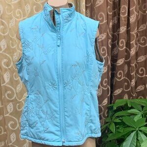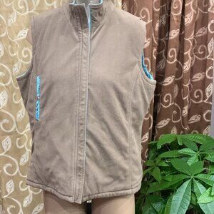 Embroidered vest on the exterior with a fleece interior candy worn on both sides has pockets on both side sides with a zipper closure