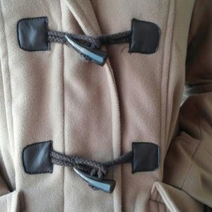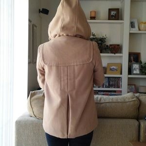 Tan coat with detachable hood and dark toggle buttons