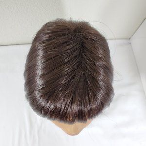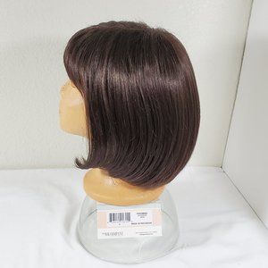 "Promise" by The Wig Company is a classic style chin-length bob with bangs. The cap has a small amount of permatease and the sides and back of the wig are open-wefted. The cap size is average. Color #4 is a dark brown, and the fibers are not heat-friendly.