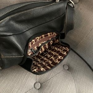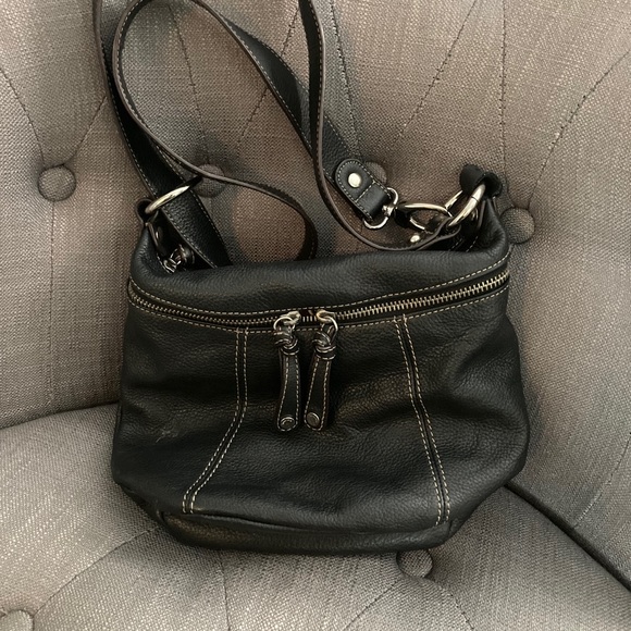 Gorgeous Tiganello black leather bucket cross body bag with built in wallet compartment. Pretty lining, efficient, and elegant. Beautiful condition.