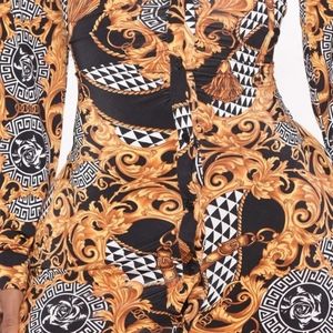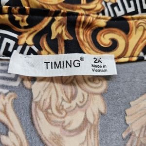 Timing brand. Long sleeve. Button down mini shirt dress. Black & gold print. Polyester/Spandex Blend. Size 2X.
