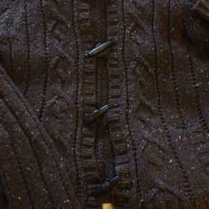 This is a comfy brown toggle sweater with a hood and light specks throughout. Perfect for warming up on those chilly days!