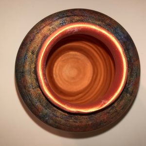 This beautiful raku art pottery by Tom Krueger is the perfect piece for your home. Display it on a mantel, shelf, or table, alone or as part of a decor grouping. The pot features unique texture and shaping, as well as a metallic coppery sheen, mottled with black, blue, green, and gold. A delicate copper wire decorates the neck of the jar. The pot measures about 5 inches tall and about 4 inches wide. Brand new with tags. Not made to hold water.