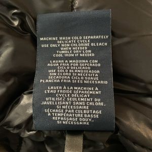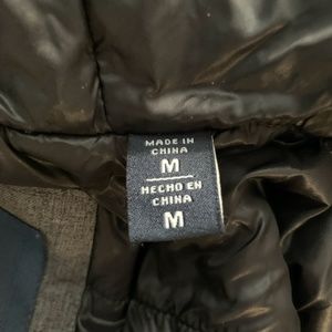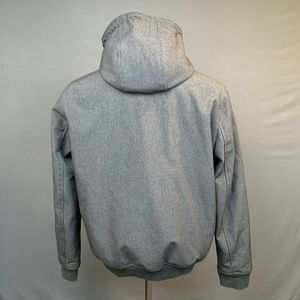 Gray hooded coat with black quilted liner in beautiful condition. Zip front, additional sleeve pocket, drawstring hood. Polyester and nylon are the main materials. Machine washable.