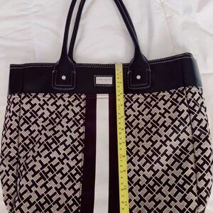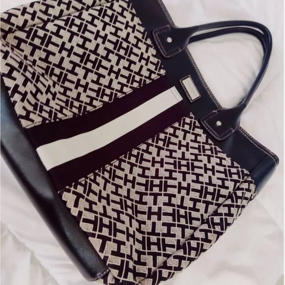 SOLD Tommy Hilfiger Logo Jacquard Leather Striped Tote Bag in Gray and Black