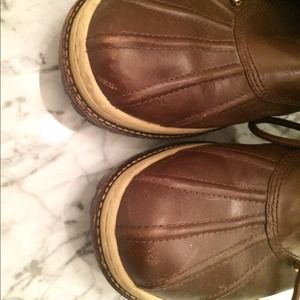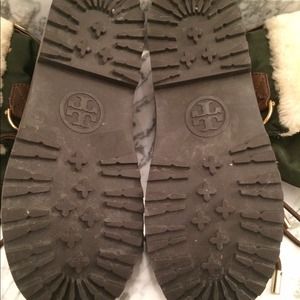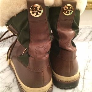 These duck boots by Tory Burch sport gold hardware and are lined with natural shearling. Pair with skinnies and oversized knits for a comfy chic look. Size 9 (fit like an 8.5) Gently worn with understandable wear on soles.