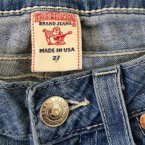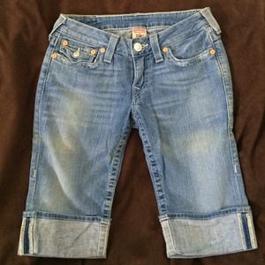 Light denim knee length shorts by True Religion. Great condition, no damages. Multicolored stitching on back pockets. 🔴Sold on Ebay🔴
