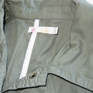 Tulle military inspired dress in size medium. This dress features a military green color with bronze snaps and closures, bronze closures from top to bottom, 2 pockets, and shoulder snaps. Super cute, ready for fall. Worn once.