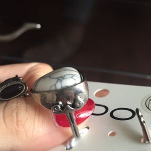 A thick ring with a black stone and detailing along the sides and and ring with a big white stone with black lines that look like cracks. Two total rings