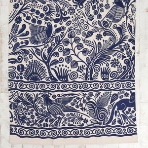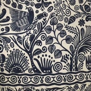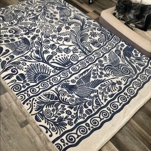 5 by 7 foot UO rug. Has been recently dry cleaned. Fun print with woodland creature Otomi motif. Navy and tan printed rug.