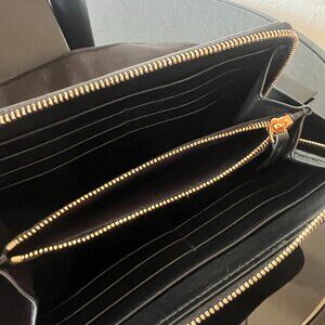 Brand new, never used, black clutch wallet- complete with dustcover, authenticity cards, and original box. *Box has slight scuffing from storage, but wallet has never been used.