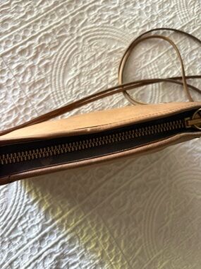 Please review each picture for condition. Wear & tear on corners, leather has scratch marks, leather pull string missing.