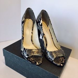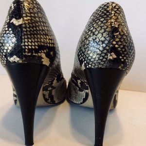 Gently used, in great condition. Has little nick at bottom of right heel, full disclosure (see last picture) This chic pump has a peep toe & features a curved 3 ½” heel. Gold/Black/Tan Leather Python Print. Leather lining/sole. Comes w/original box & new heel tips. SAD to let these go, but I had some serious health issues with my legs and can no longer wear heels like these. My loss is your GAIN! Make sure to shop my closet for more heels I need to get rid of, lots of designers.